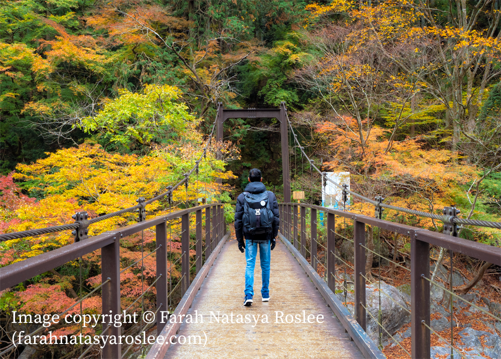 The highlight of Hatonosu Gorge is a suspension bridge across it, which offers incredible views of the Tama River below. The bridge itself is also photogenic due to the surrounding foliage.